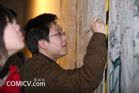 游客在贴着画纸的墙壁上作画 CV通讯社记者 寒羽信摄